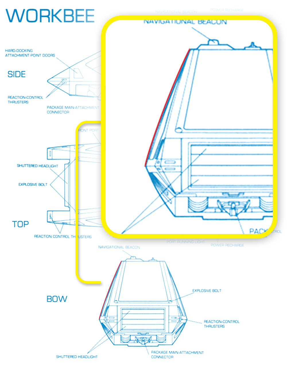 Thanks to Shawn Donovan over at the Star Trek The Motion Picture Appreciation Society on Facebook (yes that’s really a thing) he managed to send me a photo he culled from special effects genius, Doug Trumbull’s old website. A much needed, relatively usable, aft photo of the workbee. So I will be correcting and improving on the orthographic drawings I have been making, for the “spine” assembly. Then porting those over into MoI and adding it to the 3D model.