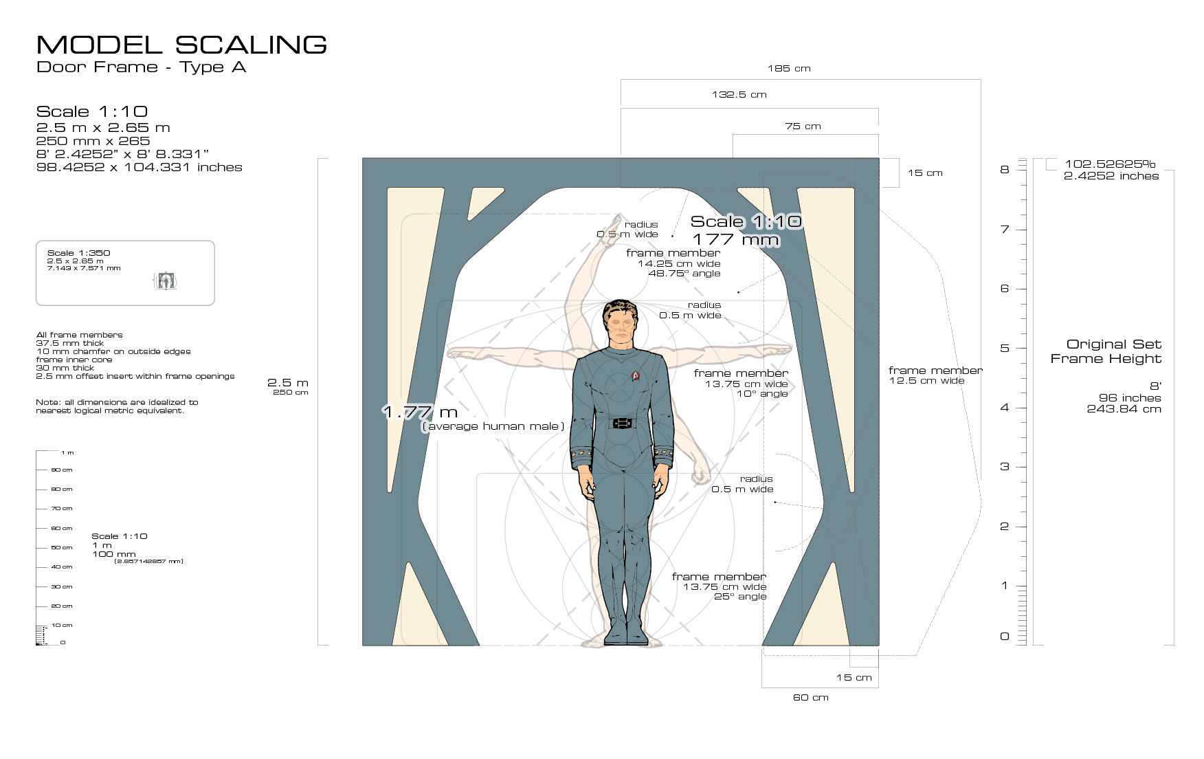 I went and looked at the whole aesthetic of the Star Trek universe as shown in the Star Trek: The Motion Picture. From the corridor archway frames, which were recycled and used again on the television series Star Trek: The Next Generation (and where I got a lot of the actual set-diminesions which fans had unearthed and culled over the years)… to the color system the costume designers came up with for the insignias worn on the uniforms, it should all ideally “make sense” if you put enough thought into it.