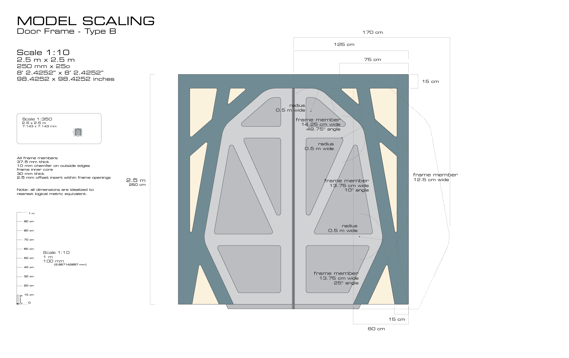 I then took the derived cargo pods elevation drawings, and matched them up the drawings I reworked (to their nearest logical metric equivalent for the actual set dimensions) of the corridor section and doorway arches.