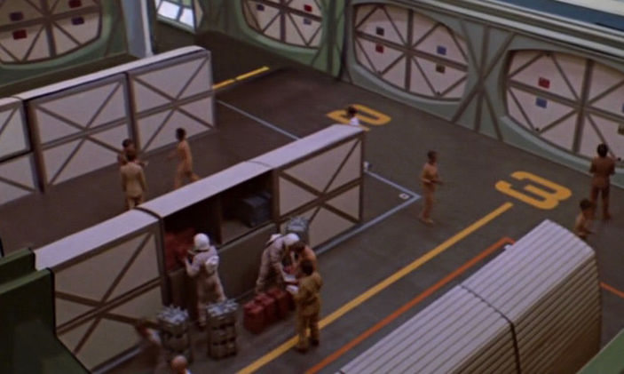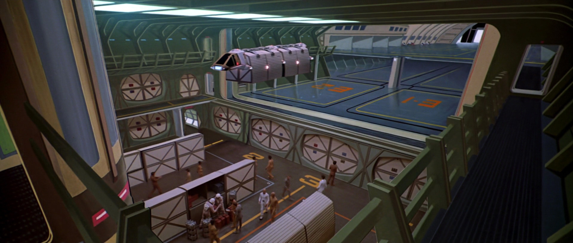 Workbee towing the cargo pod train into the Enterprise cargo hold, from Star Trek: The Motion Picture.