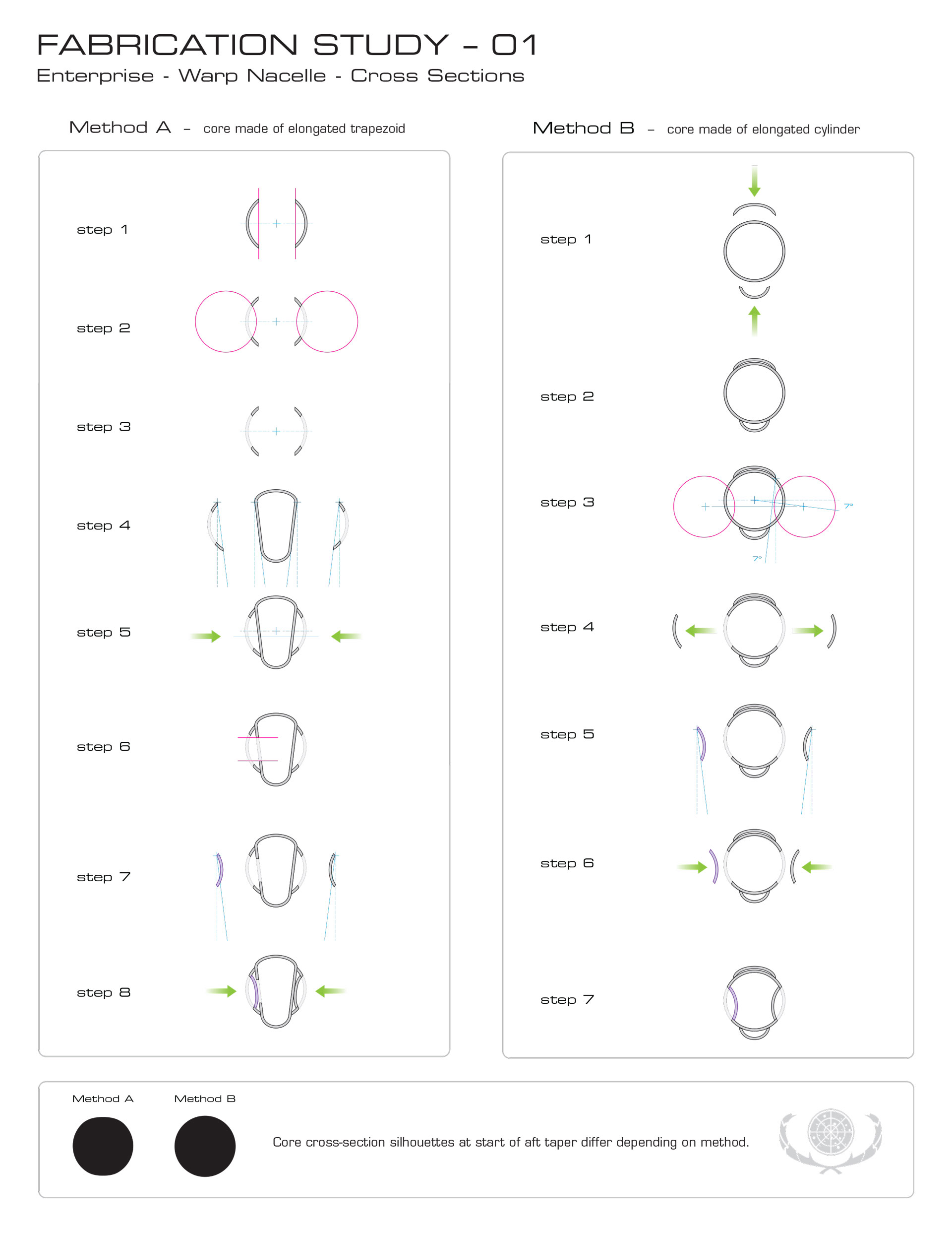 Taylor: Well the answer is “Method A”. I did everything I could to make the nacelles more rectilinear and not circular. That was one of the things about the original television Enterprise, was that the nacelles to me looked like cigar tubes. I mean that whole circular, rounded look led me to really push to get the thing more linear and not circular, even in the cross-section. So the answer again is “Method A.