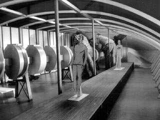 Due to size limitations on Paramount’s Stage 9, where the movie interior sets where built and filmed, the forced-perspective portion of the set created the illusion of the long “tunnel”.