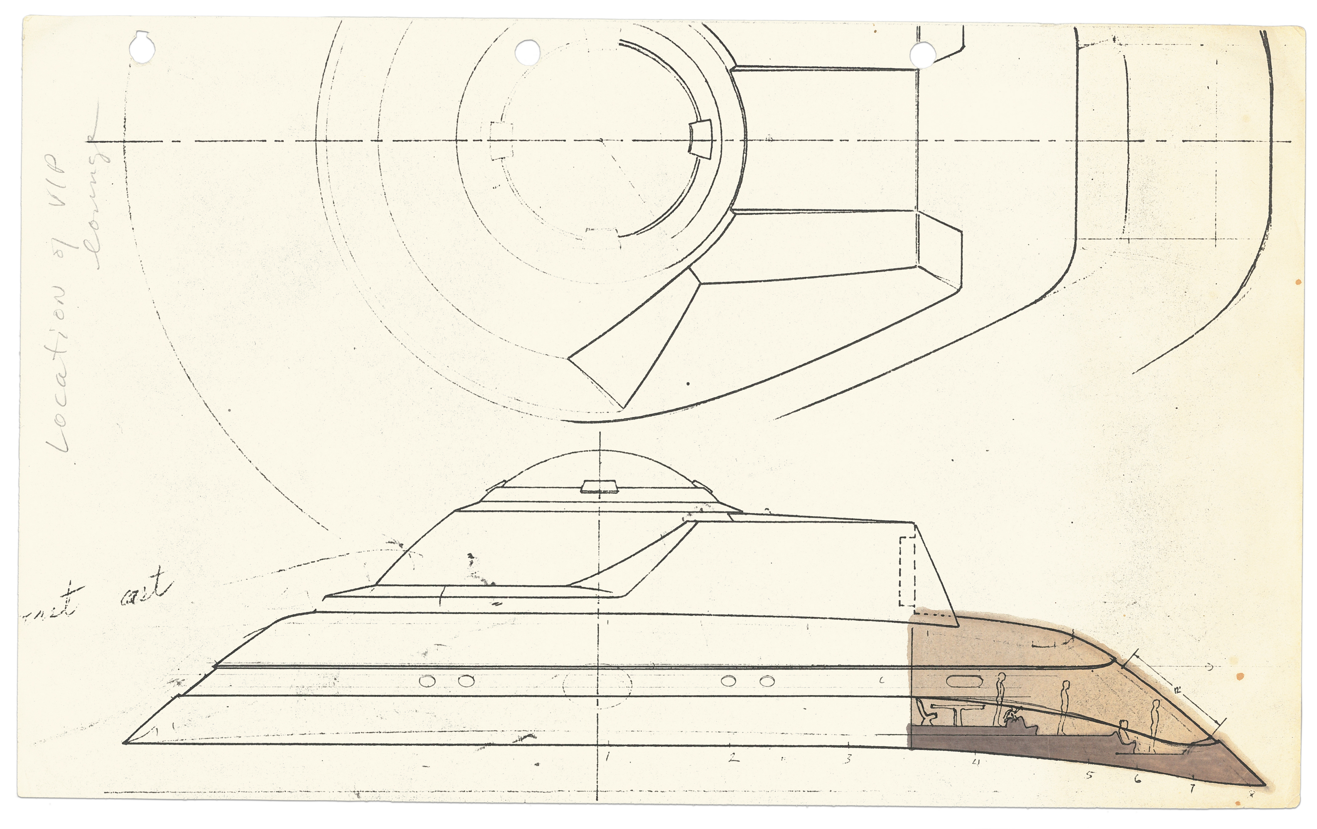 Digital re-creaton of a production sketch by Andrew Probert working out the VIP lounge location.