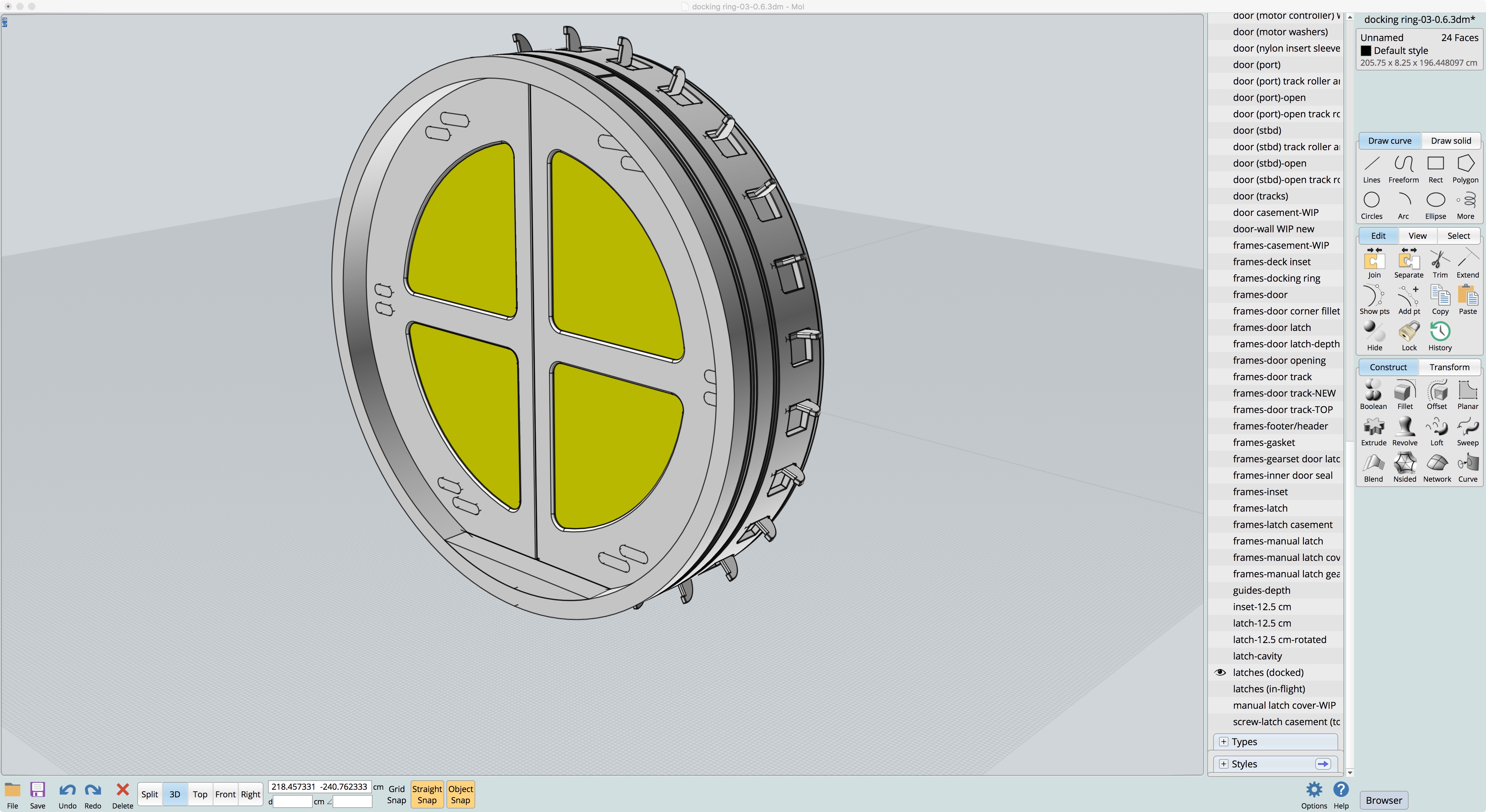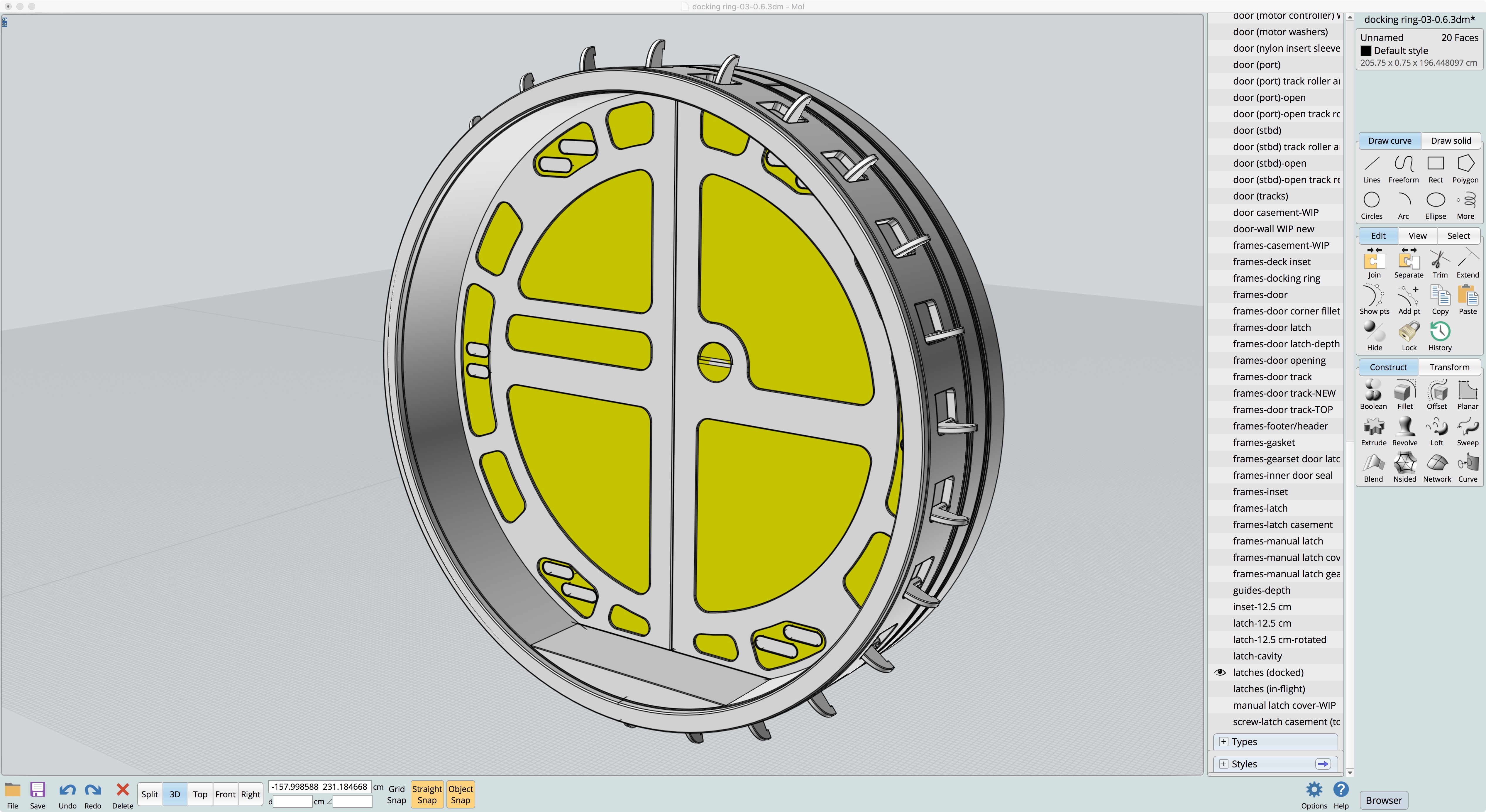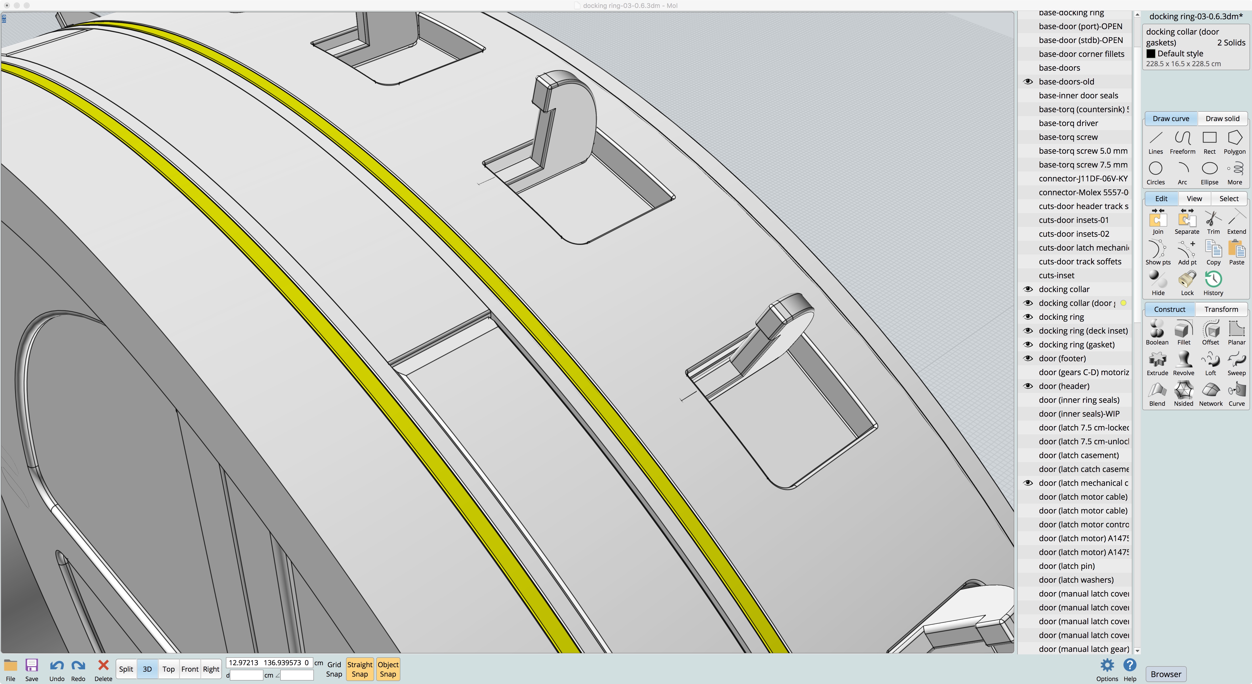 In this next screenshot of the work-in-progress 3D model shown on the right, I have the areas highlighted in yellow which—if there was a set of expandable dielectric elastomer sealing rings—would solve the door seal issues when docked and the doors opening.