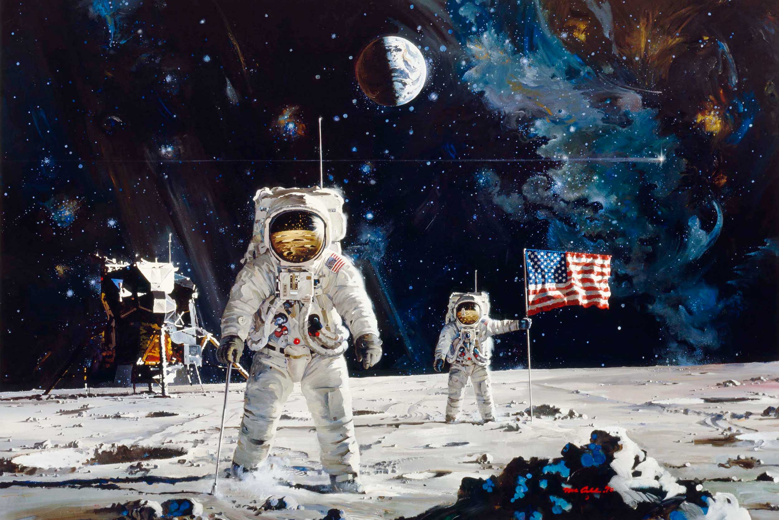 Robert McCall’s 1971 oil on canvas painting titled “First Men on the Moon” in the collection of Broadway National Bank, San Antonio, Texas.