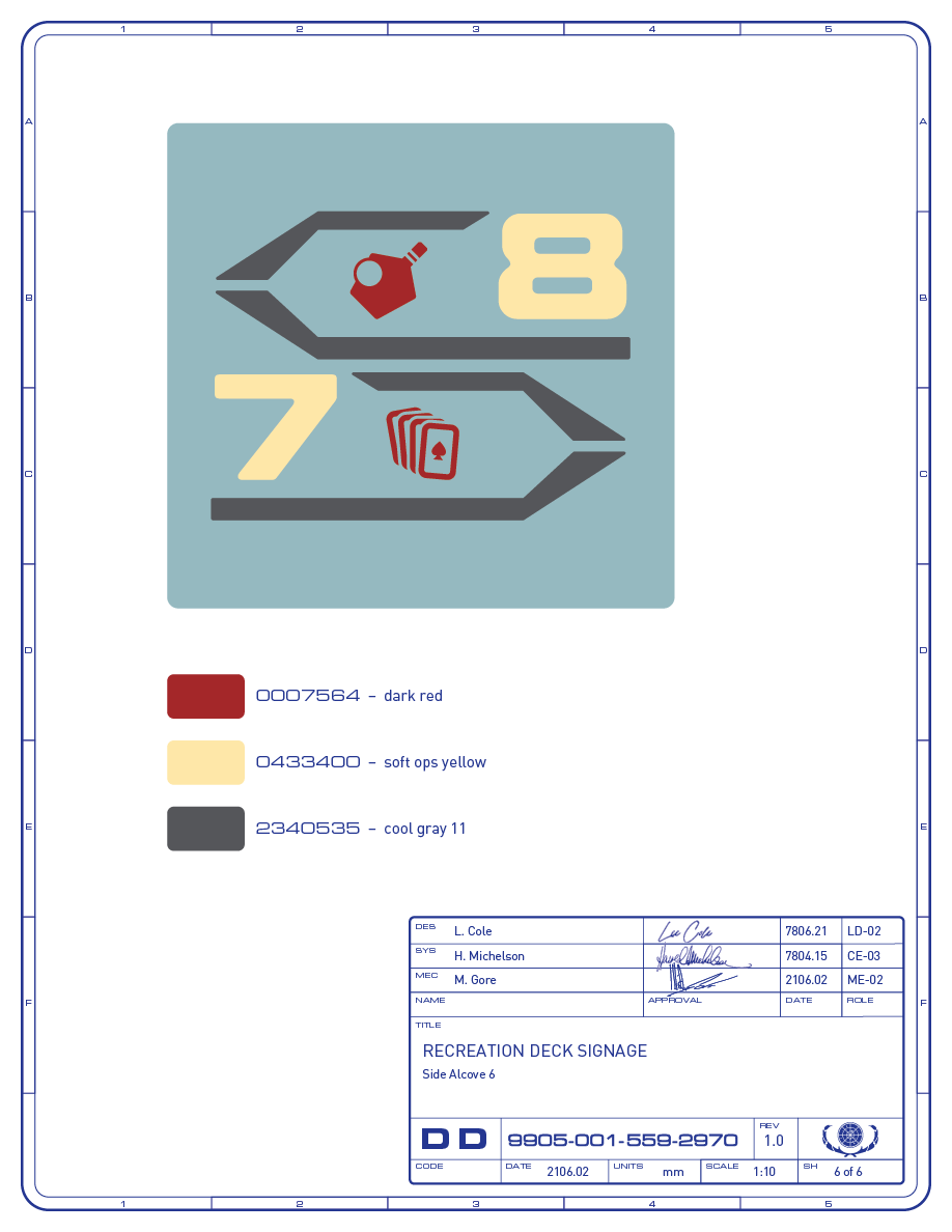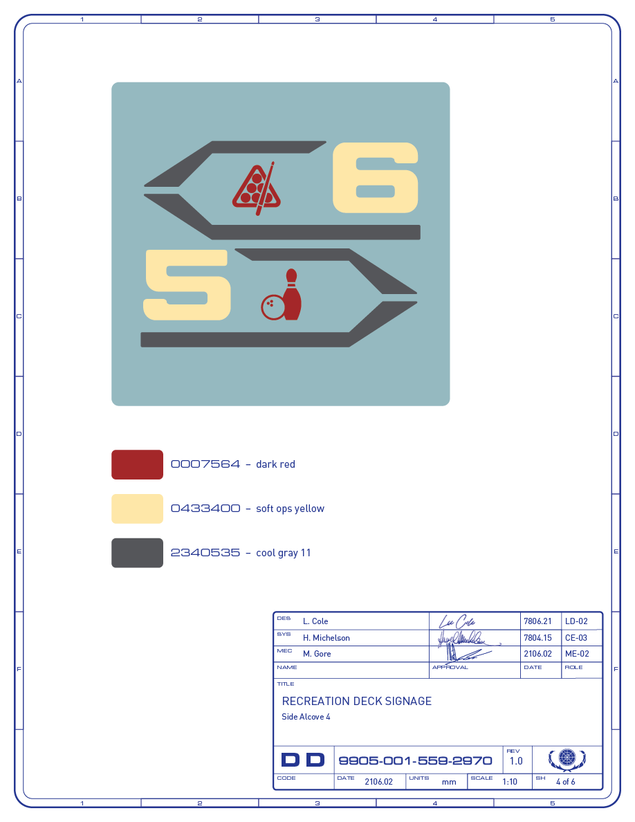 That there were only six “official” designs I could reference, and each of the alcoves contained two pictograms in the directional graphics, this caused a bit of a dilemma. I also figured the “bowling” pictogram would only really be used once, I opted to simply come up with two original pictogram designs. This lead me to create new pictograms for “billiards” and for “card games”. This in conjunction with repeating the pictograms that directionally are pointing to the same area behind the side-wall sections, would yield the number of graphics needed.