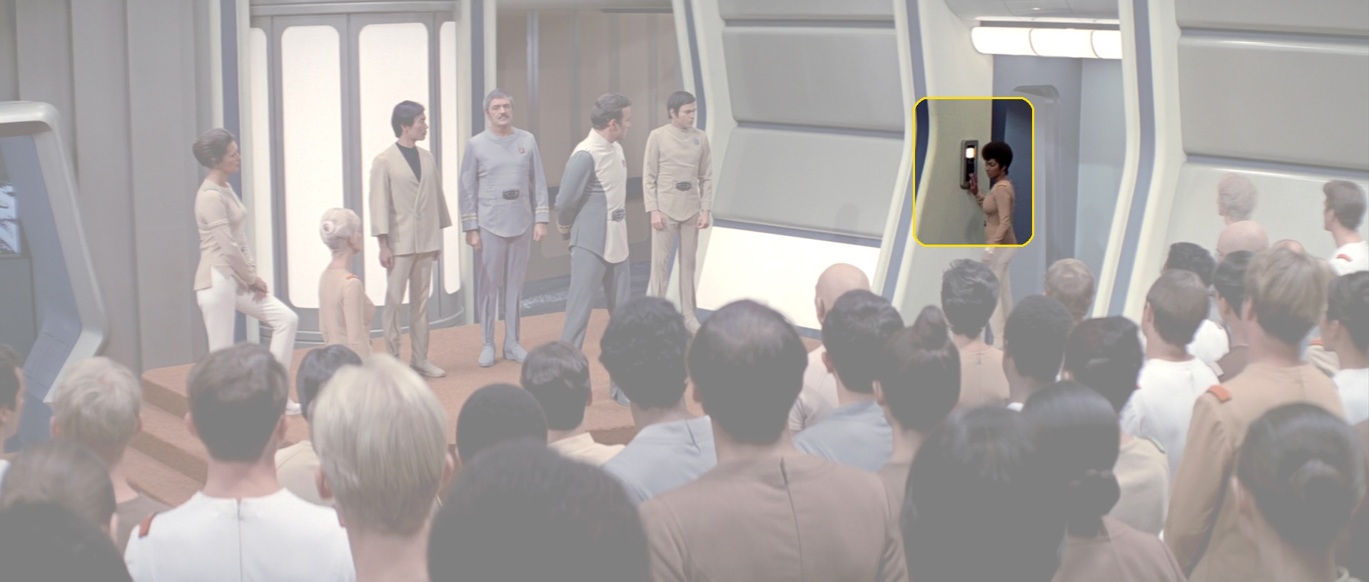 The wall panel (which I have dubbed the “multimedia intercom panel” is visible in the first side alcove on the recreation deck, in the scene where Kirk addresses the assembled crew in Star Trek: The Motion Picture (TMP). There are only a couple of shots in the scene where it is visible, and most are fairly far away from the panel. This made getting precise details and sizing a challenge.