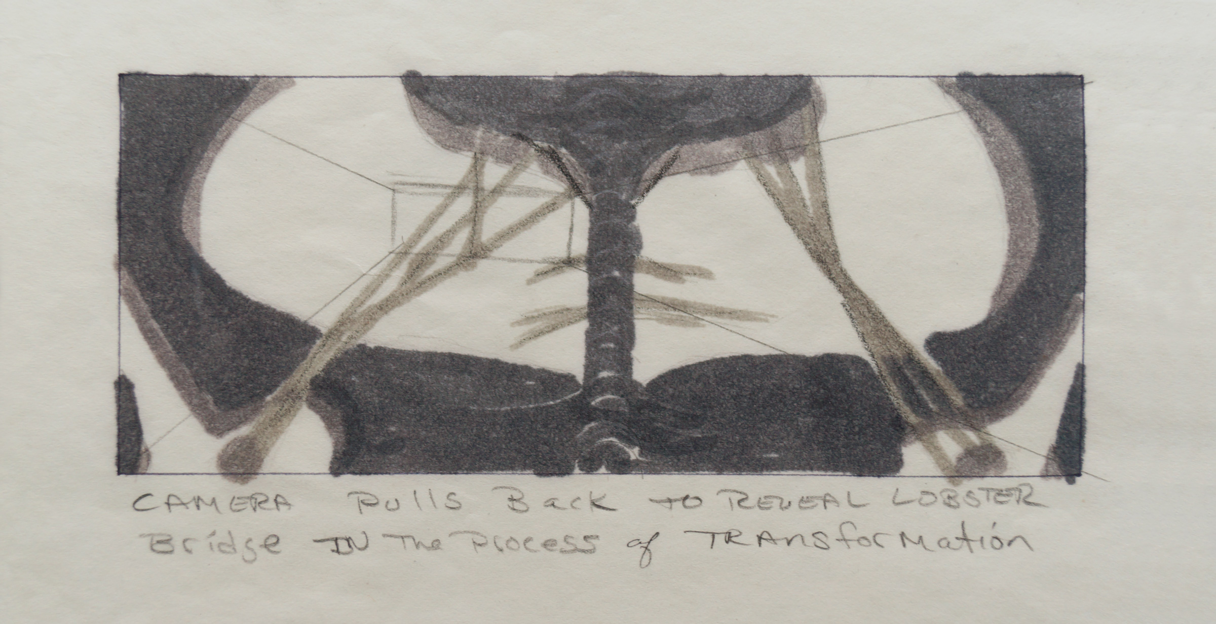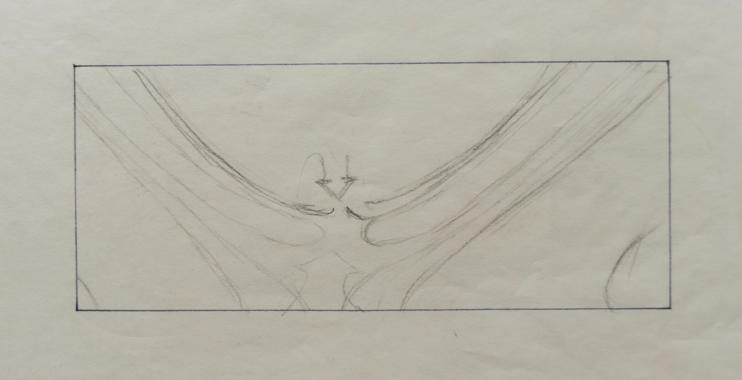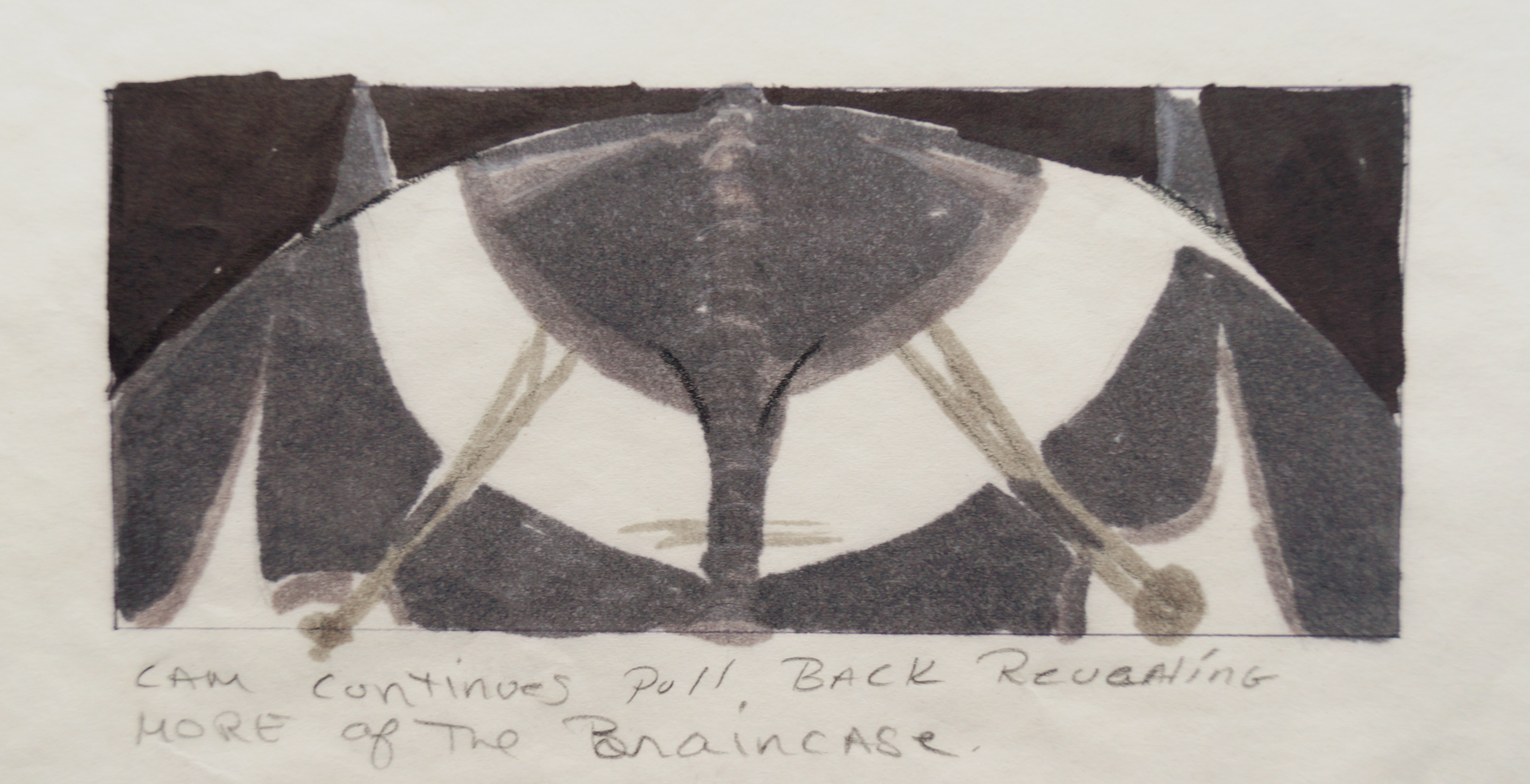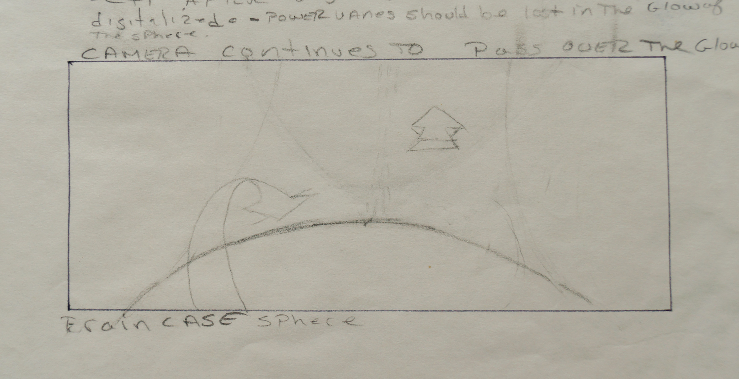 The other larger piece is a storyboard sketch showing some of the “spine” and “valley” areas of V’ger’s surface. This does look like one of the sequences that was shot and appears in the film. Specifically the shot where after Captain Kirk orders Sulu to take the Enterprise to within 500 meters of V’Ger, and Kirk order “reverse angle on the viewer” as the Enterprise begins its close fly-over.