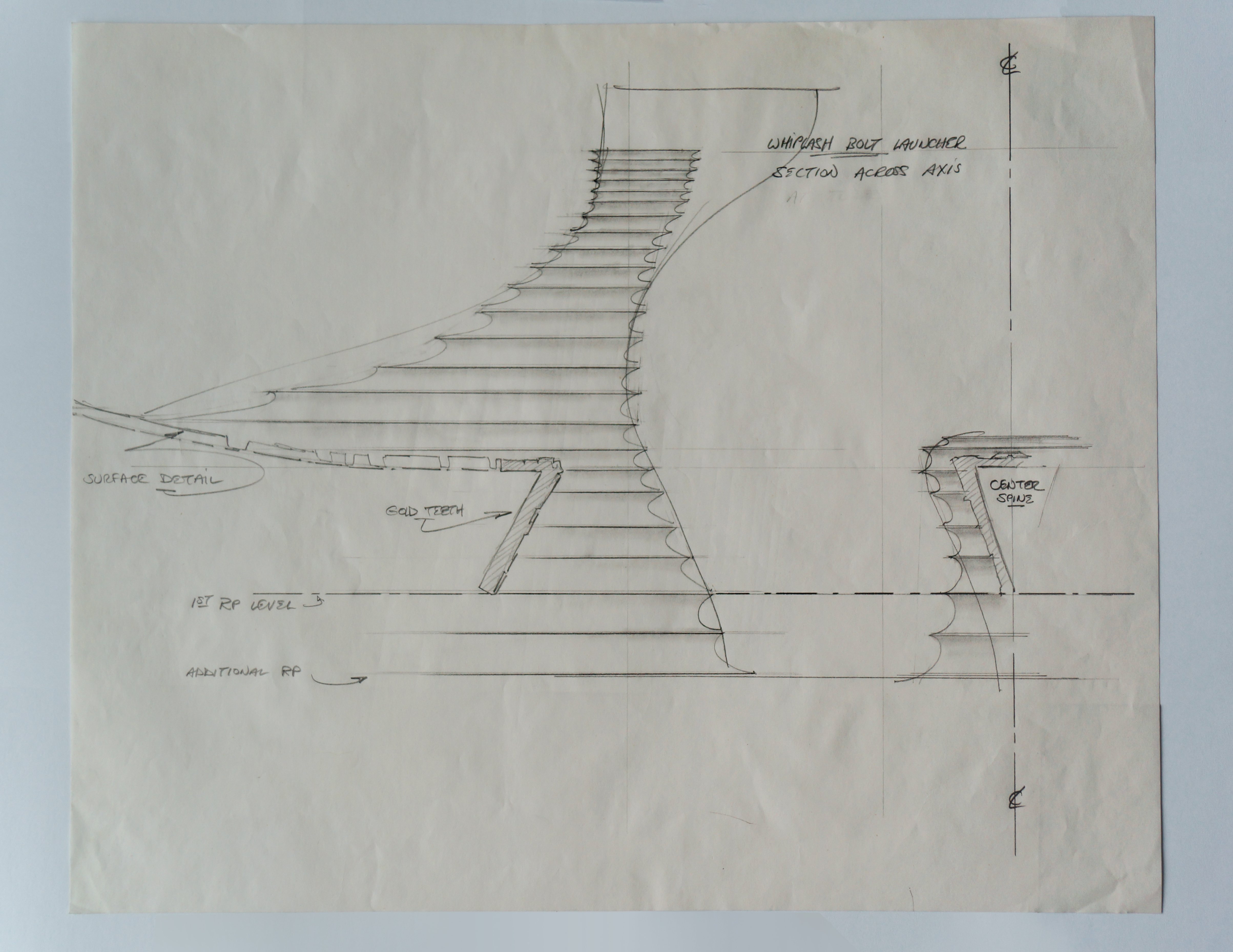 Apogee production sketch of an elevation section of the whiplash bolt launcher tower and central spine for producing the V’ger filming miniature. Drawing size 17.125″ x 14″ (43.5 x 35.55 cm), pencil on tracing paper.