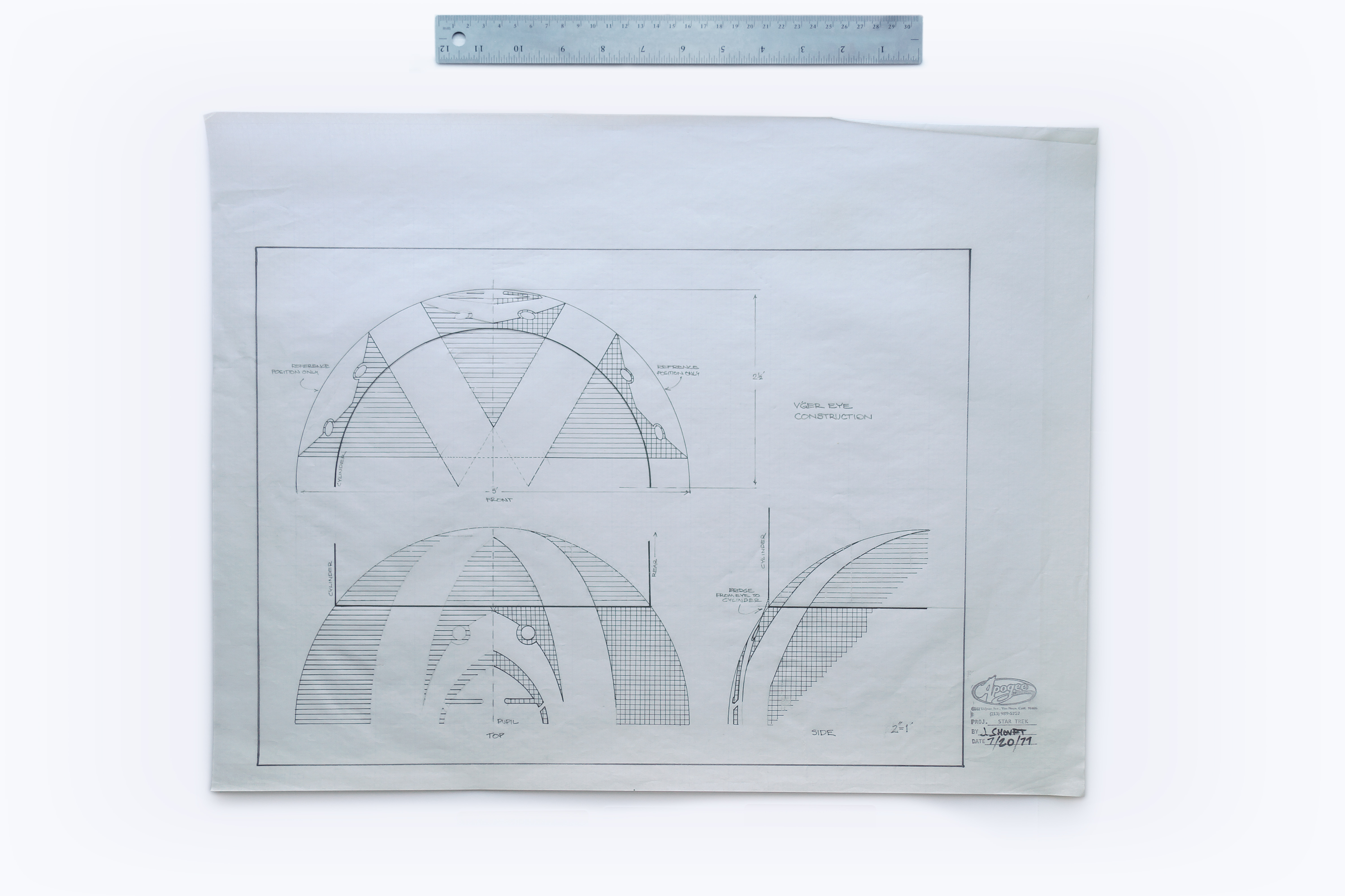 17″ x 22″ production drawing of V’ger filming miniature eye construction by John Shourt of Apogee Inc. for Star Trek: The Motion Picture, dated 07/20/1979. (Image: Third Wave Design)